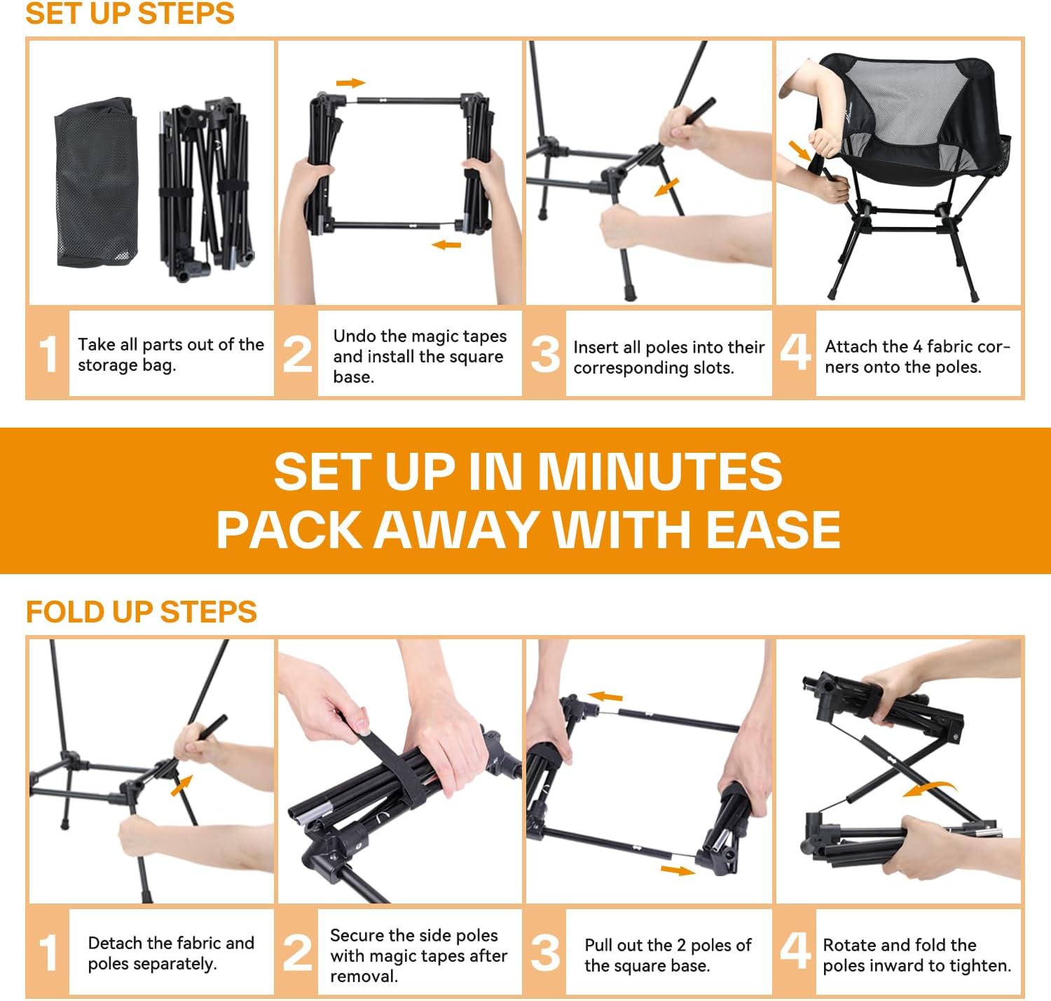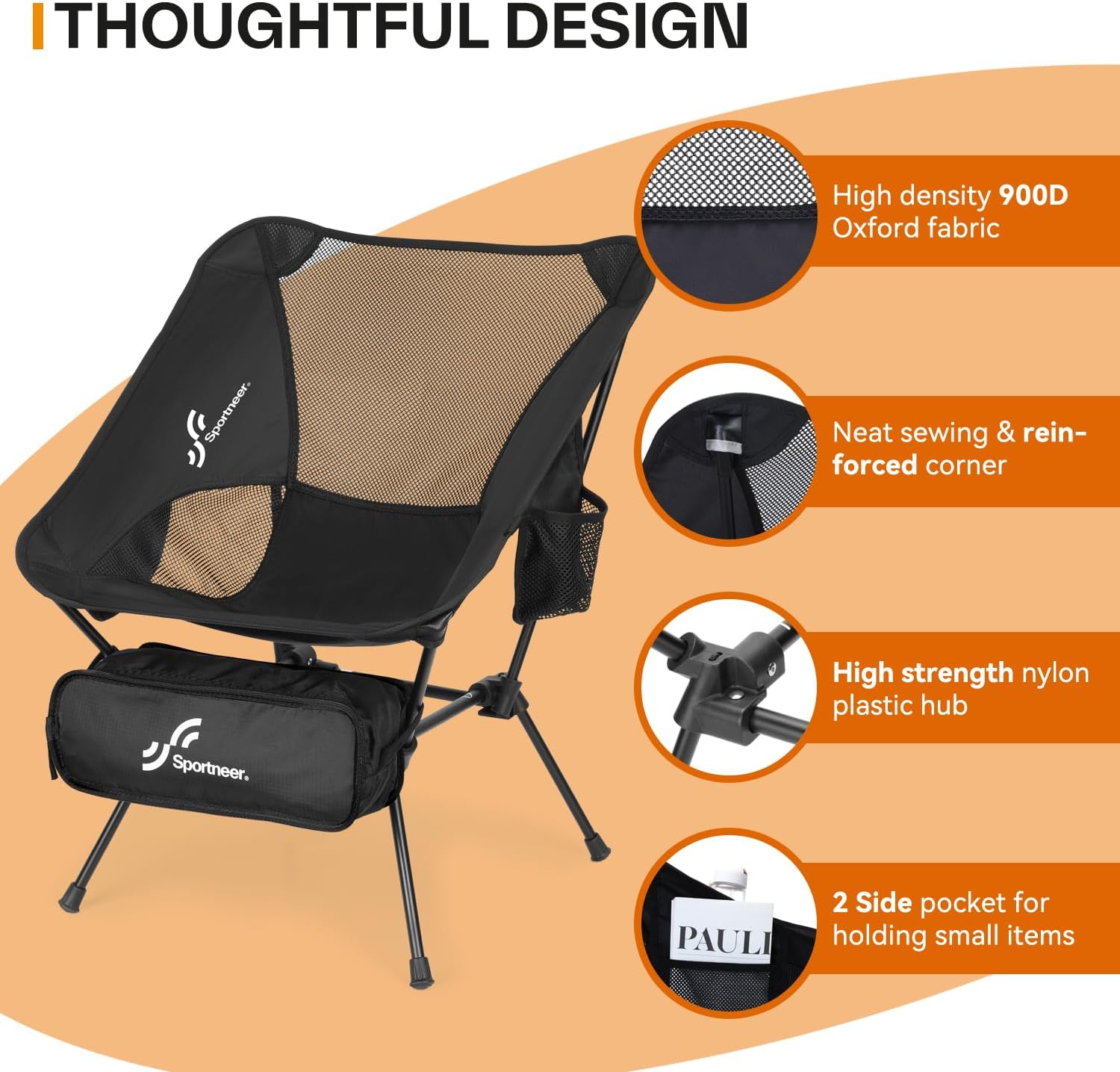 Ultralight & Compact: When you’re going camping, hiking or beach, you need all the convenience you can get! The Sportneer camping chairs only weighs 2.4 lbs and can be folded into a 13.5″ * 4.5″ * 5.5″ one, making it easy to bring along. Take an outdoor adventure with the ultralight camp chair stored in the carry-on bag.