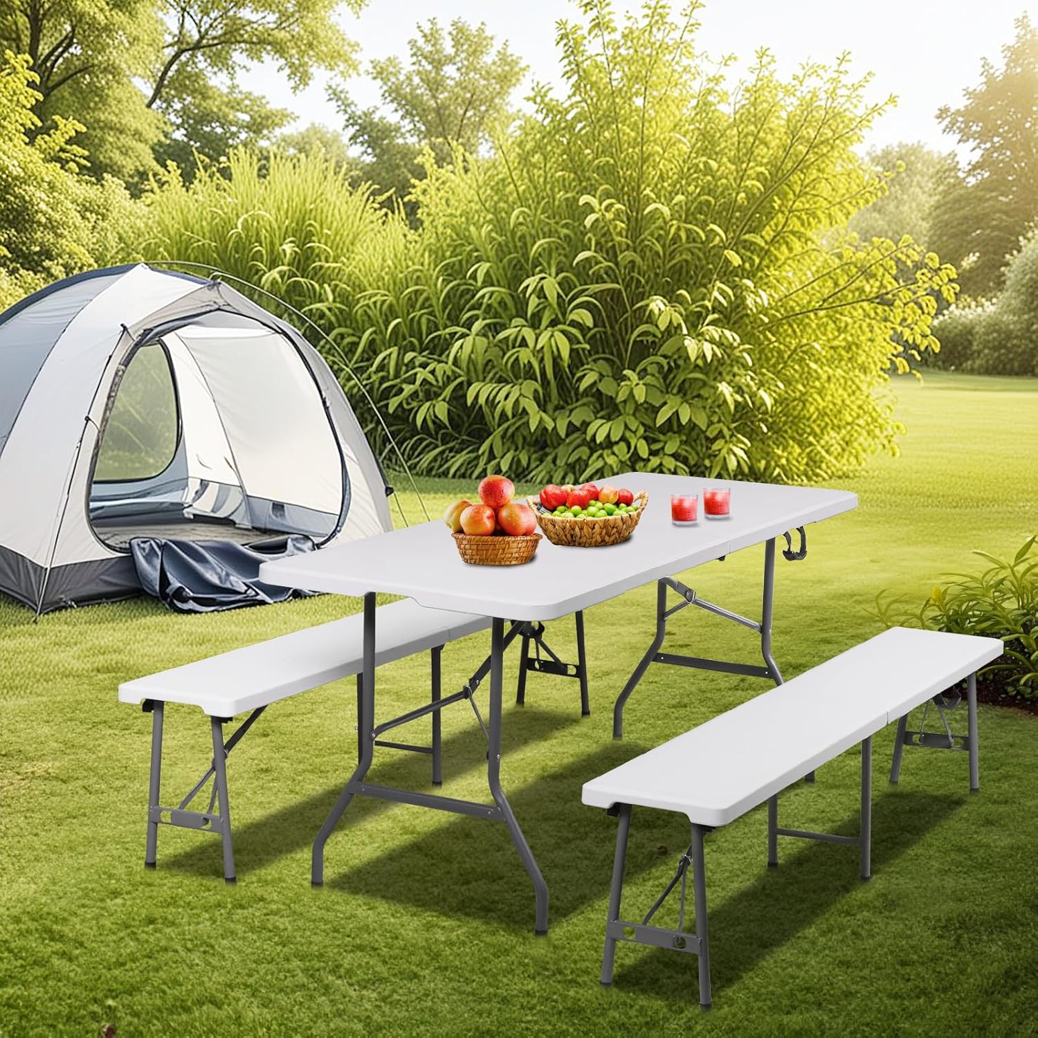 SUPER DEAL Folding Table Set with 2 Benches, 6 FT Camping Picnic Table Set, Outdoor Indoor Portable Furniture for Working Meeting Wedding Party w/Handle and Safety Lock, White