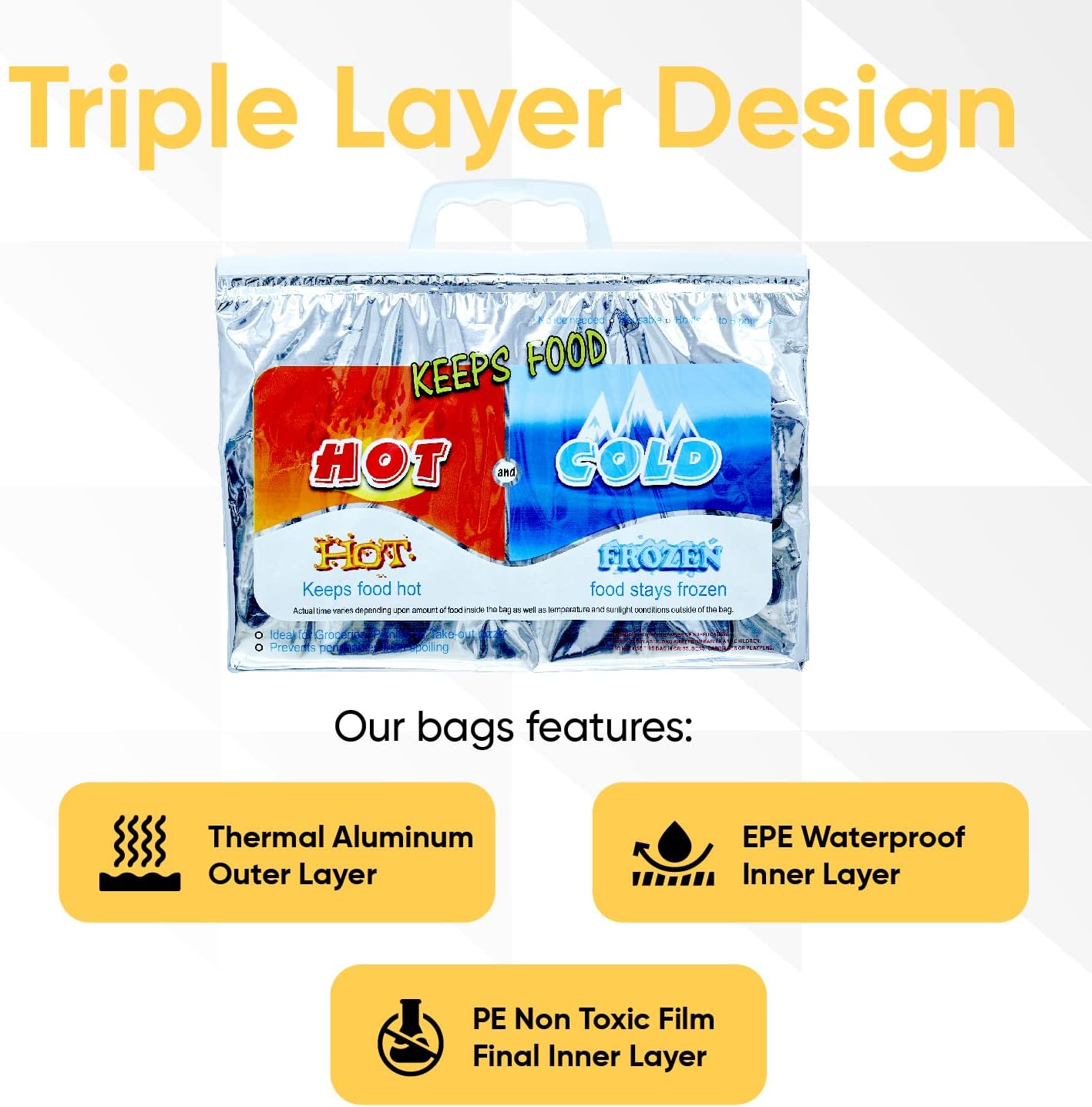 ✅ TRIPLE LAYER DESIGN – Most other bags are single layer and aren’t efficient at maintaining internal temperatures or will start to leak moisture. Our bags feature a sturdy thermal aluminum outer layer, an inner EPE (eco friendly plastic) waterproof layer and a final inner PE non toxic film layer.