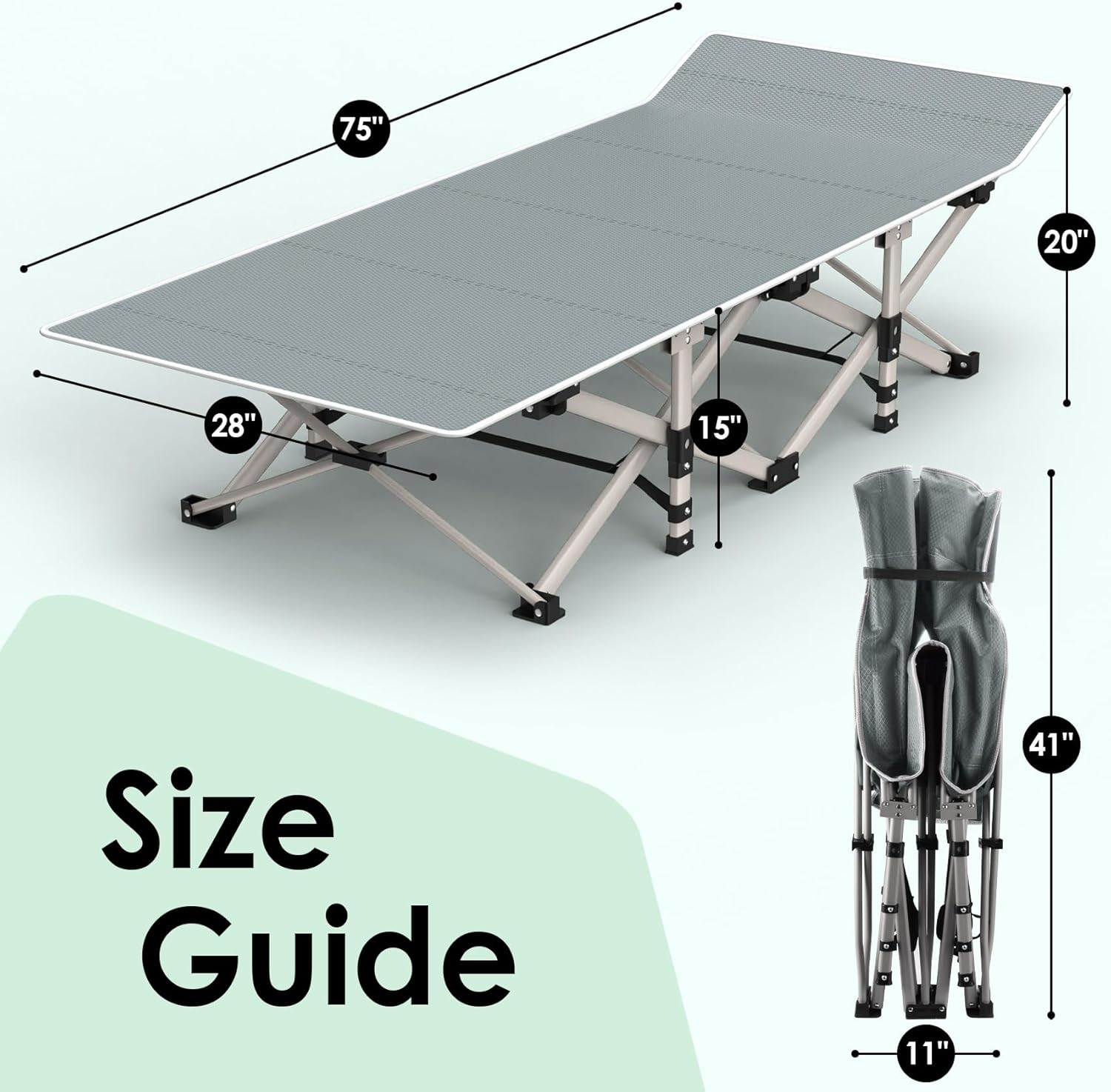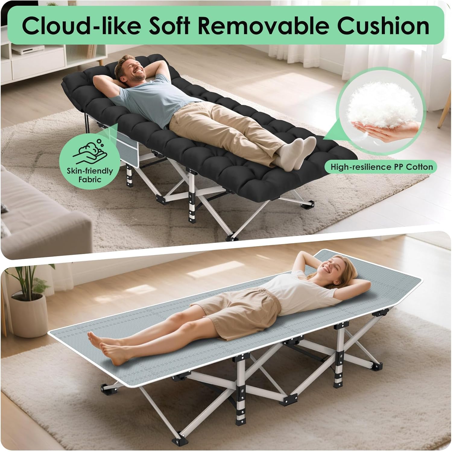 【TIPS】Our oversized pad is vacuum-packed, and it will be naturally fluffy within 1-3 hours after unpacking. To unfold the cot to lay flat, please refer to the manual