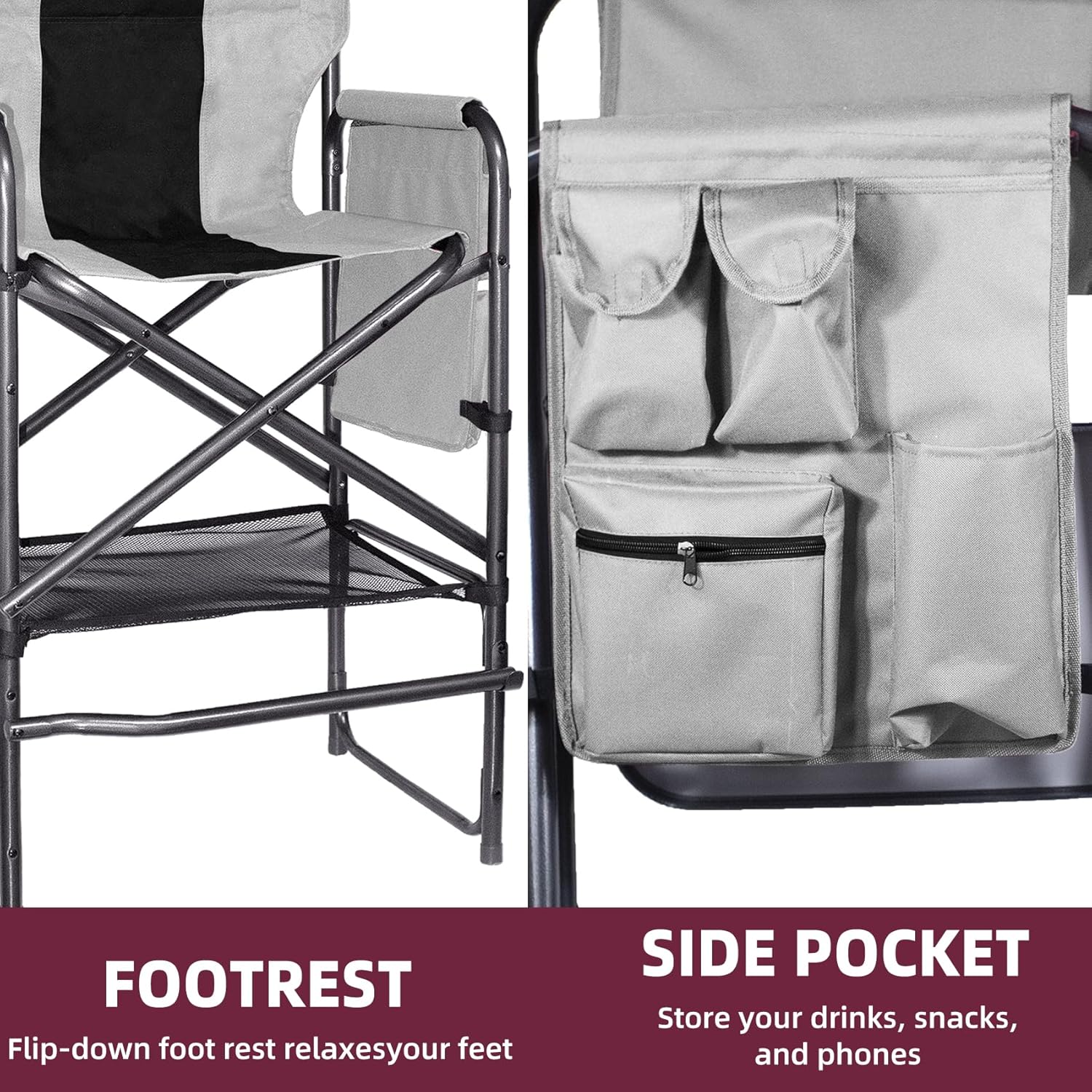 Tall Directors Chair 30″ Seat Height, Bar Height Folding Chair with Side Table, Foldable Camping Chair with Side Pocket for Makeup Artist, Sports Event, Supports 400LBS – Black/Gray