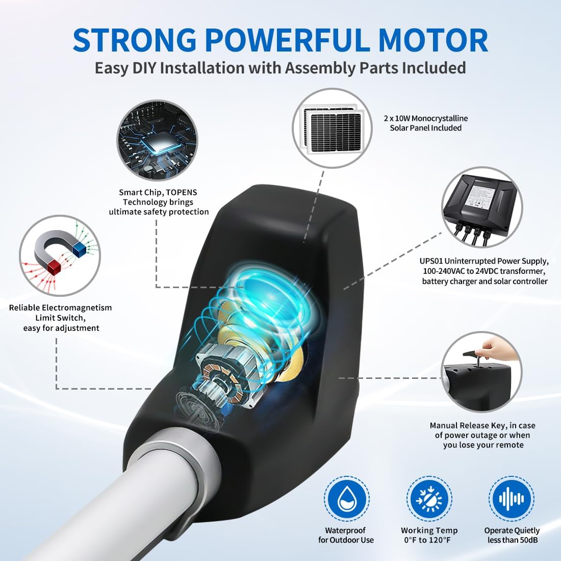 TOPENS AT6131S Solar Automatic Gate Opener features a 24VDC 50W motor with higher efficiency, lower power consumption, and greater safety. It is designed as a high performance kit for Medium Duty single swing gates up to max 660lbs. in weight OR max 18ft. in length. This ultra-quiet electric gate motor will bring your family an easier and more comfortable life.