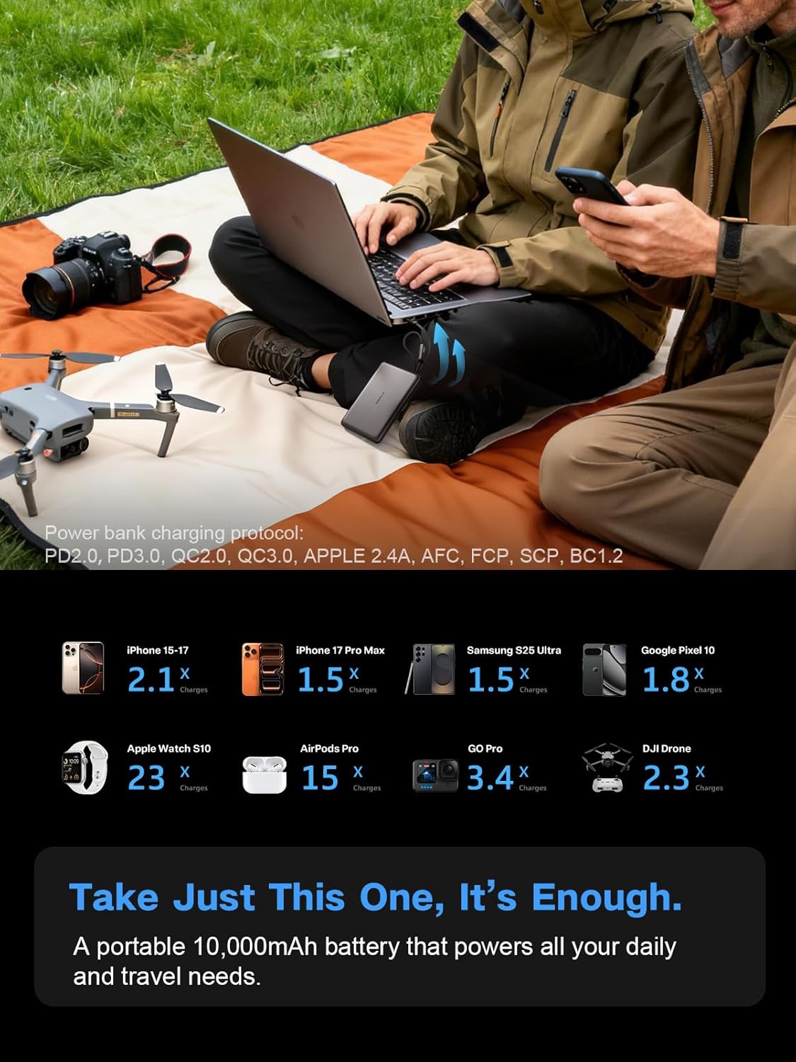 【Seamlessly Compatible with Your USB-C Devices】Comes with two built-in USB-C braided cables and works with iPhone 17/16/15/Pro/Pro Max, Samsung Galaxy S25/S24/S23/S22/S21/S20/S10/S9/S8, Galaxy Z Fold 6/5/4/3, Galaxy Z Flip 6/5/4/3, Galaxy Note 20/10, Galaxy A73/A54/A33/A23, Google Pixel 8/9/10, and other Android phones and tablets, plus AirPods, Nintendo Switch, Steam Deck, GoPro, drones, and more. For short trips, one power bank is all you need