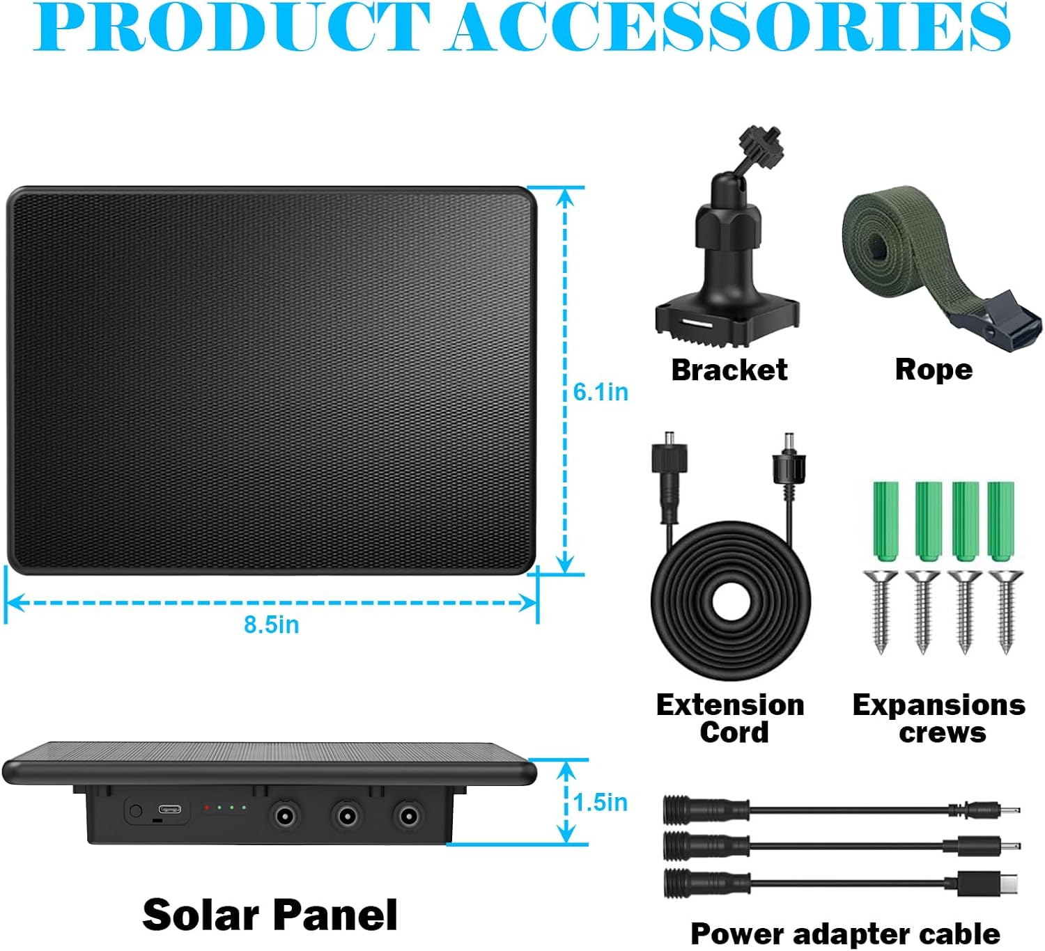 【Complete Kit Includes】This trail camera solar panel package includes: 1×6W solar panel (with built-in 8000mAh Li-ion battery), 1×mounting bracket, 1× extension cable (2.1mm), 3× adapter cables (1.7/1.35mm/USB-C), 1×screw kit, 1×6ft hoop strap, 1×user manual. If you encounter any problems or have any questions, please feel free to contact our customer service team