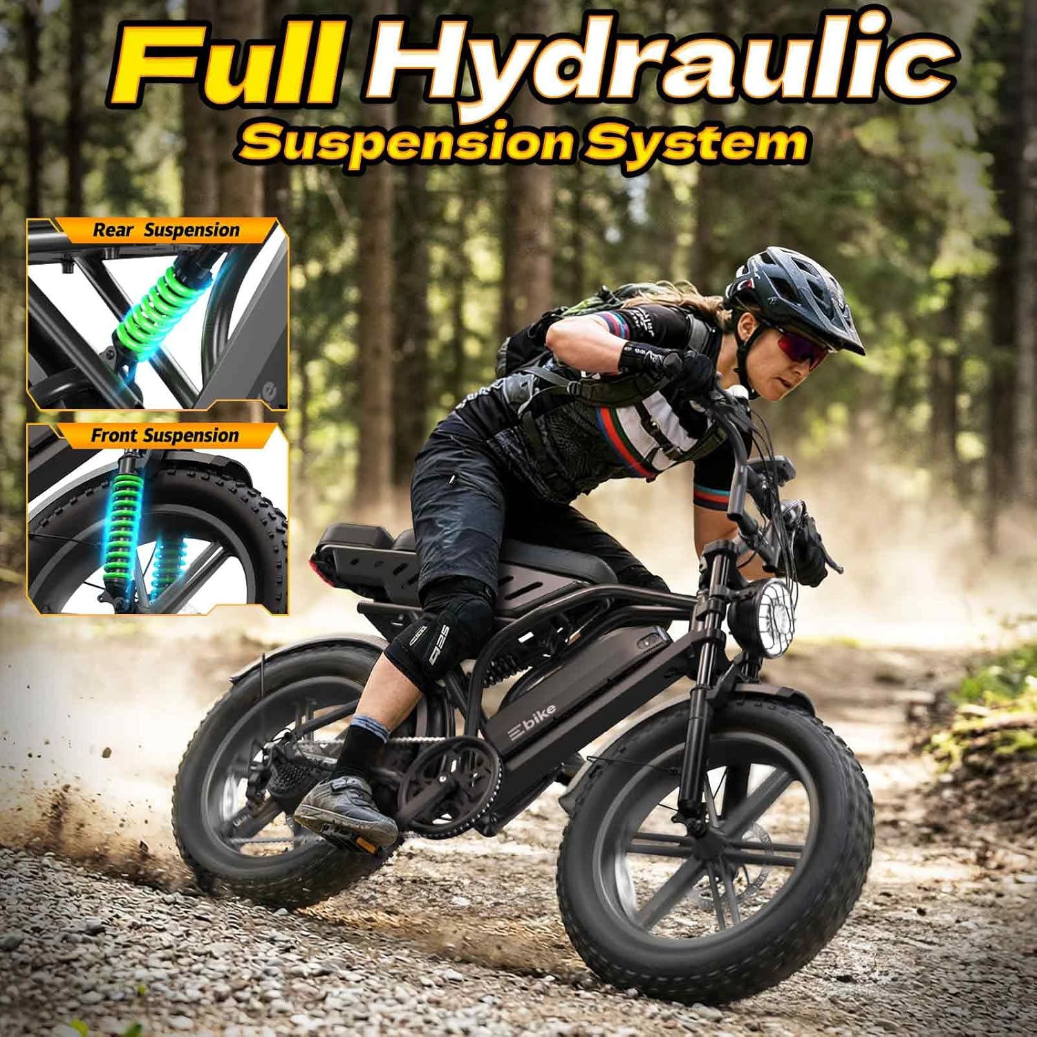 【Comfortable Riding Experience】 This fat tire electric bike is equipped with front and rear suspension system, which absorbs most of the bumps and vibrations during riding, providing a more comfortable riding experience and reducing body fatigue. 20″x 4″ puncture-proof snow tires for electric motorcycle provide a stronger grip, ensuring the vehicle’s stability and easily handle any adventure