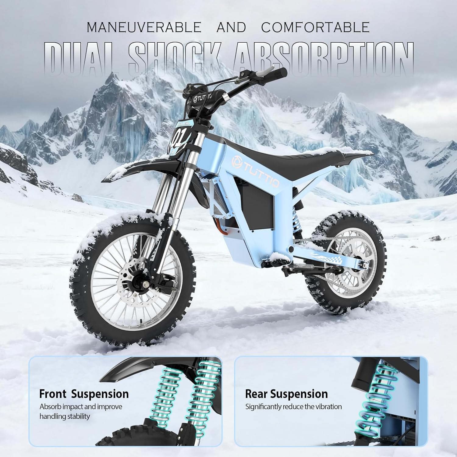 Safety & Comfort – The front wheel of Tuttio Soleil01 GB dirt bike is equipped with a state-of-the-art suspension hydraulic fork system, while the rear wheel is equipped with an independent suspension high stiffness air spring shock absorber, absorb shocks and bumps, hydraulic brakes for responsive and efficient stopping power,can fully protect your safety and ultimate experience. (Exercise caution on wet, slippery or uneven terrain)