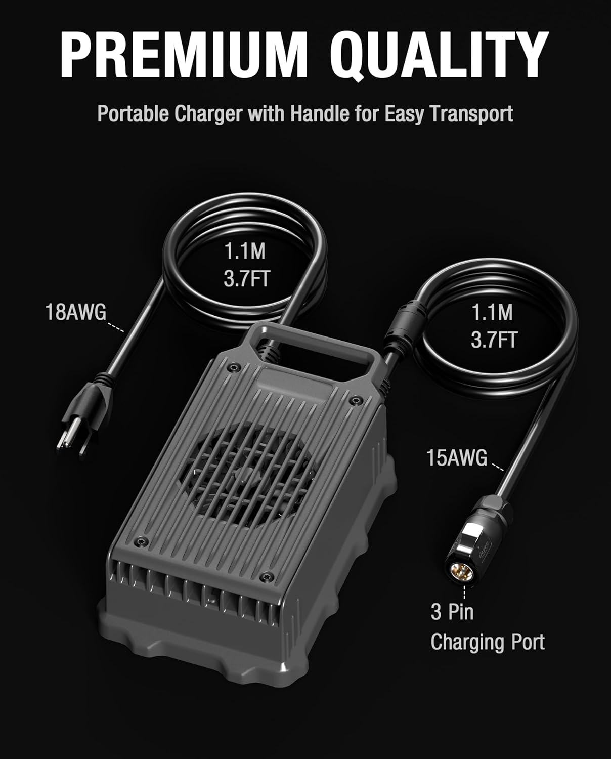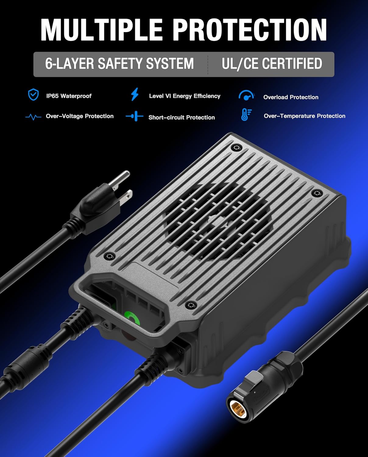 【CHARGE WITHOUT RISK】Design with the flame resistant aluminum shell and built-in fan cooling system, which greatly improved the heat dissipation efficiency. Multiple Protections and IP65 Waterproof Rating also ensure the safety in charging.