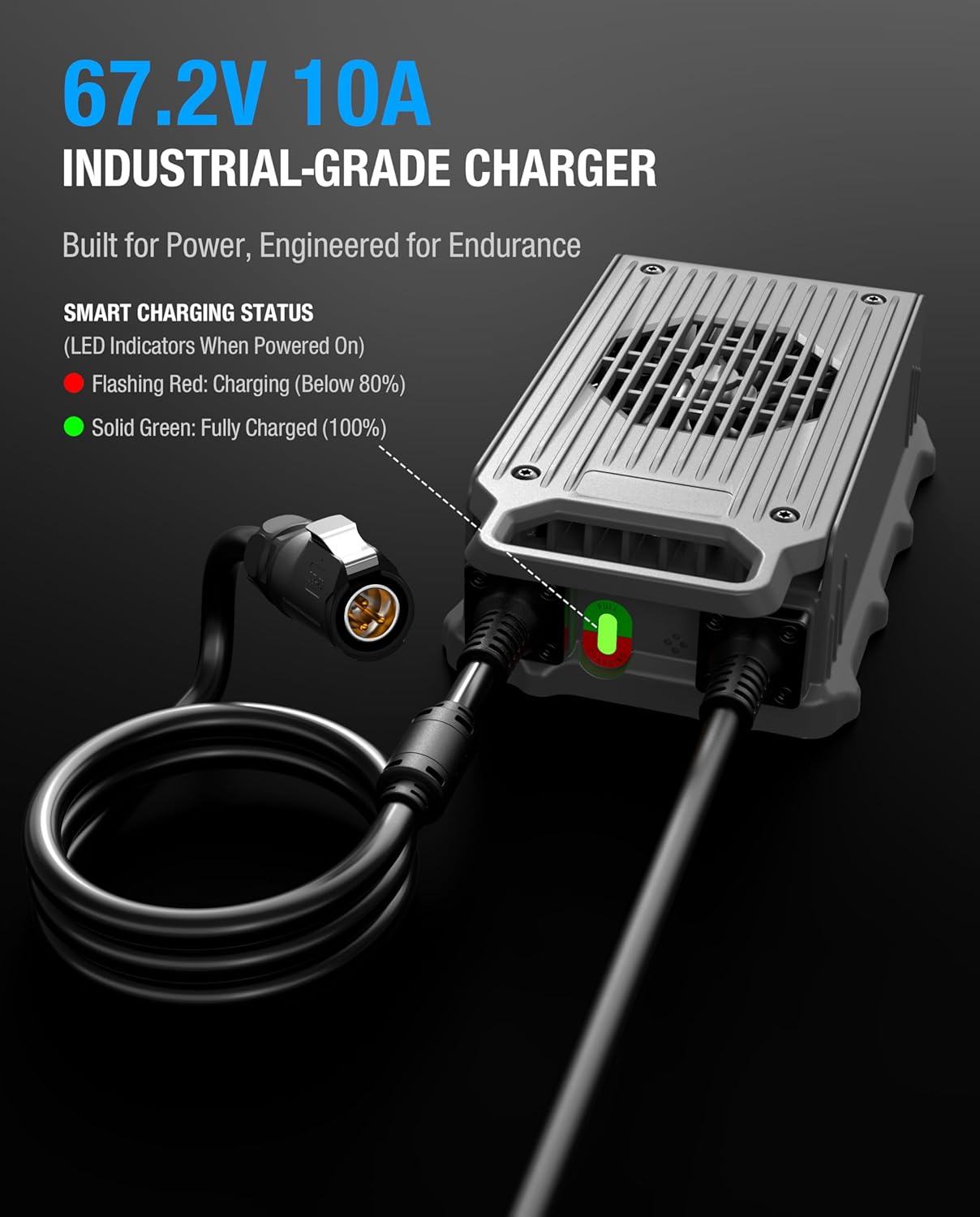 【67.2V 10A RAPID CHARGER】INPUT: 100-240VAC, OUTPUT 67.2V 10A, Max. Power is up to 672W. The feature of low energy consumption and high energy efficiency will accelerate the charging speed to save your time.