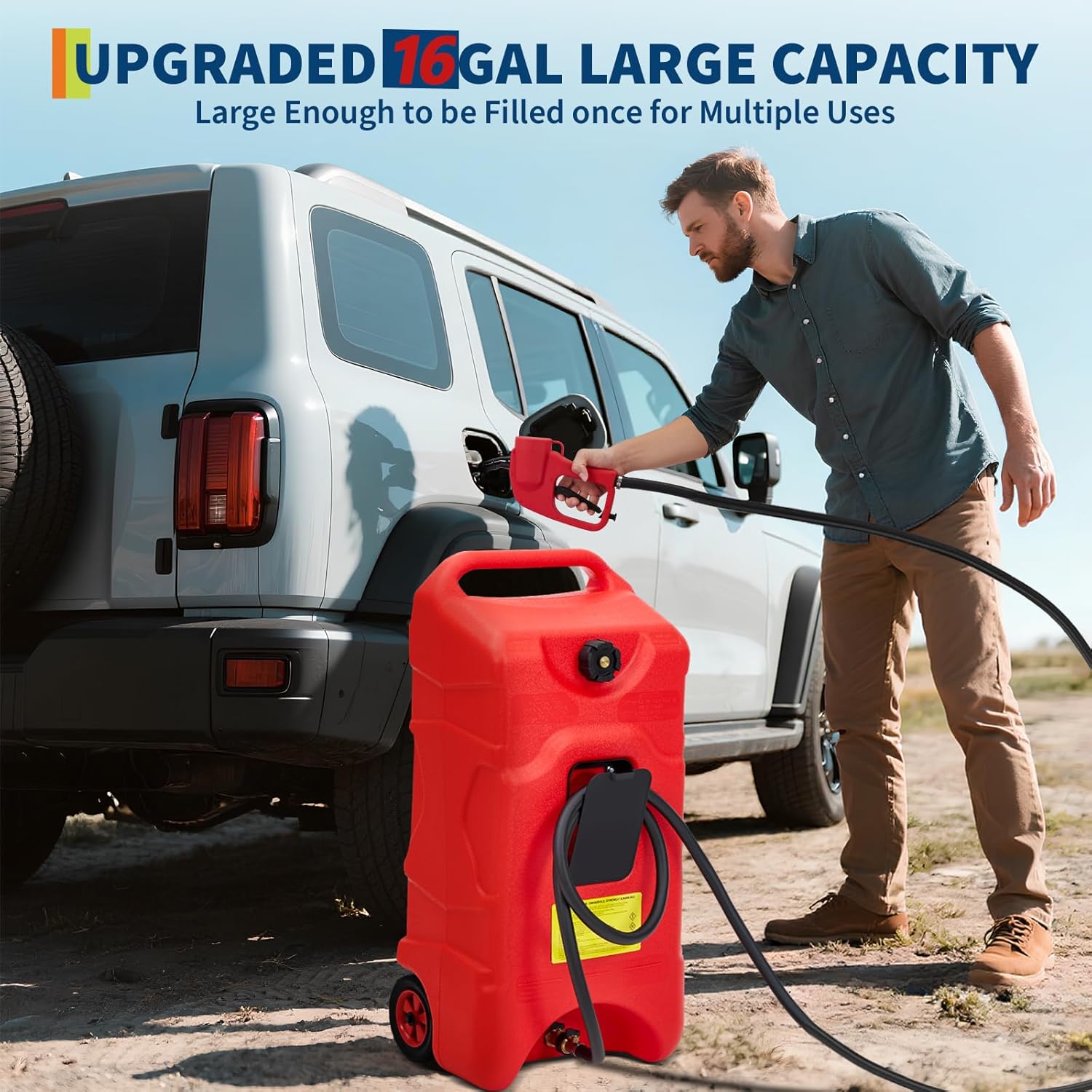 Upgraded 16 Gallon Gas Tank, Heavy-Duty Fuel Can with Manual Transfer Pump & 10FT Hose, Portable Gas Can with Casters, Leak-Proof Gas Container for Lawn Mowers, Tractor, Boat, Snow Blow