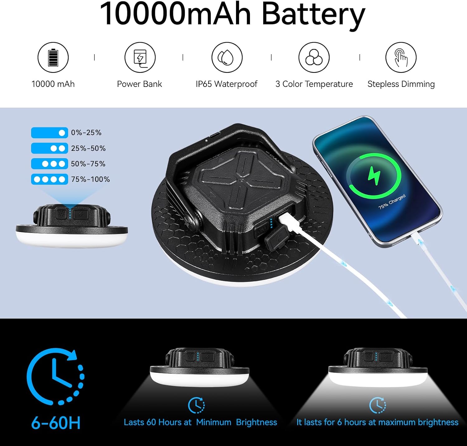 [3 lighting modes & Stepless Dimming]: Our camping lights is dimmable, Short press to switch between 3 lighting modes (3500K/5500K/9000K), Long press to adjust brightness, providing you with the perfect lighting for any occasion, whether it’s a cozy campfire setting or a bright emergency situation.