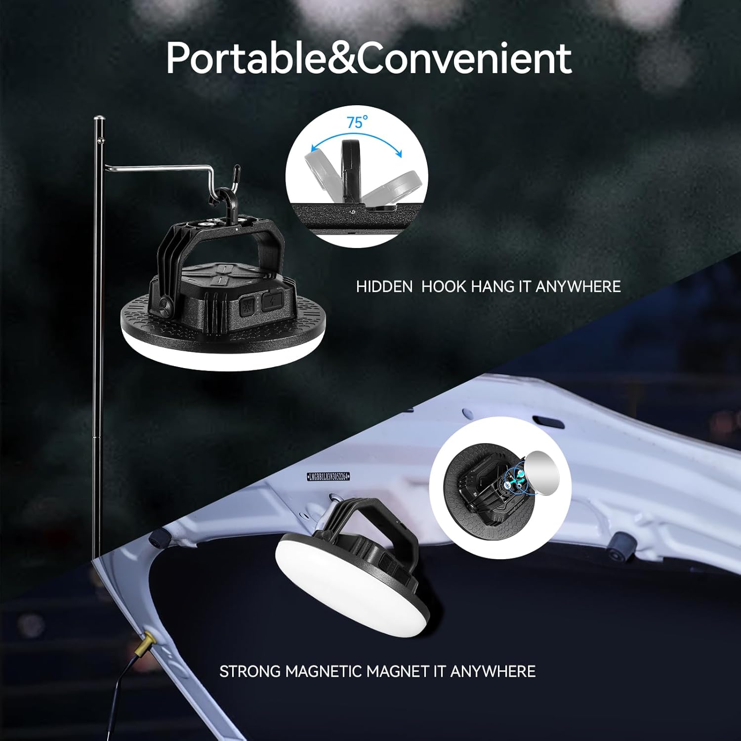 [Hanging & Magnetic design] : Our camping lantern added a hook can hang the lamp on branches or tents and easy to carry on your backpack. The stand can rotate 90 degrees, allowing you to choose the most suitable lighting angle, The built-in powerful magnet on the back can attach it to metal surface anywhere you want.
