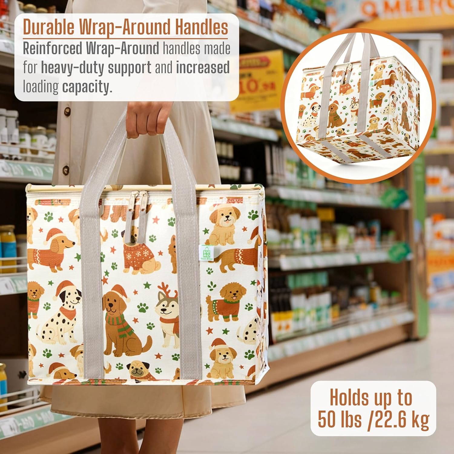 VENO 2 Pack Cooler Bag, Insulated Grocery Bags for Food Delivery, Collapsible Cooler, Reusable Shopping Bags for Groceries, Hard Bottom, Water Resistant, Zippered, Foldable (Holiday Pups, 2 Pack)