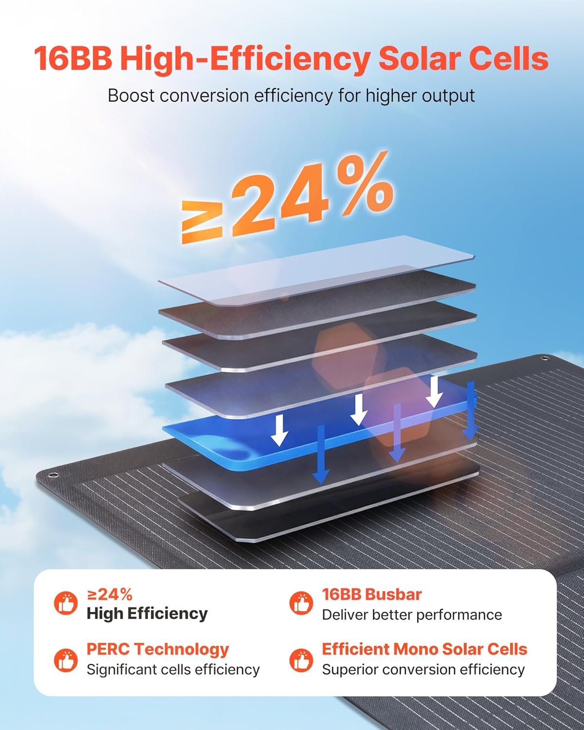 Featuring 16BB high-efficiency monocrystalline solar cells with ≥ 24% conversion efficiency, this solar panel captures more sunlight and ensures steady, consistent energy output to keep your devices powered.