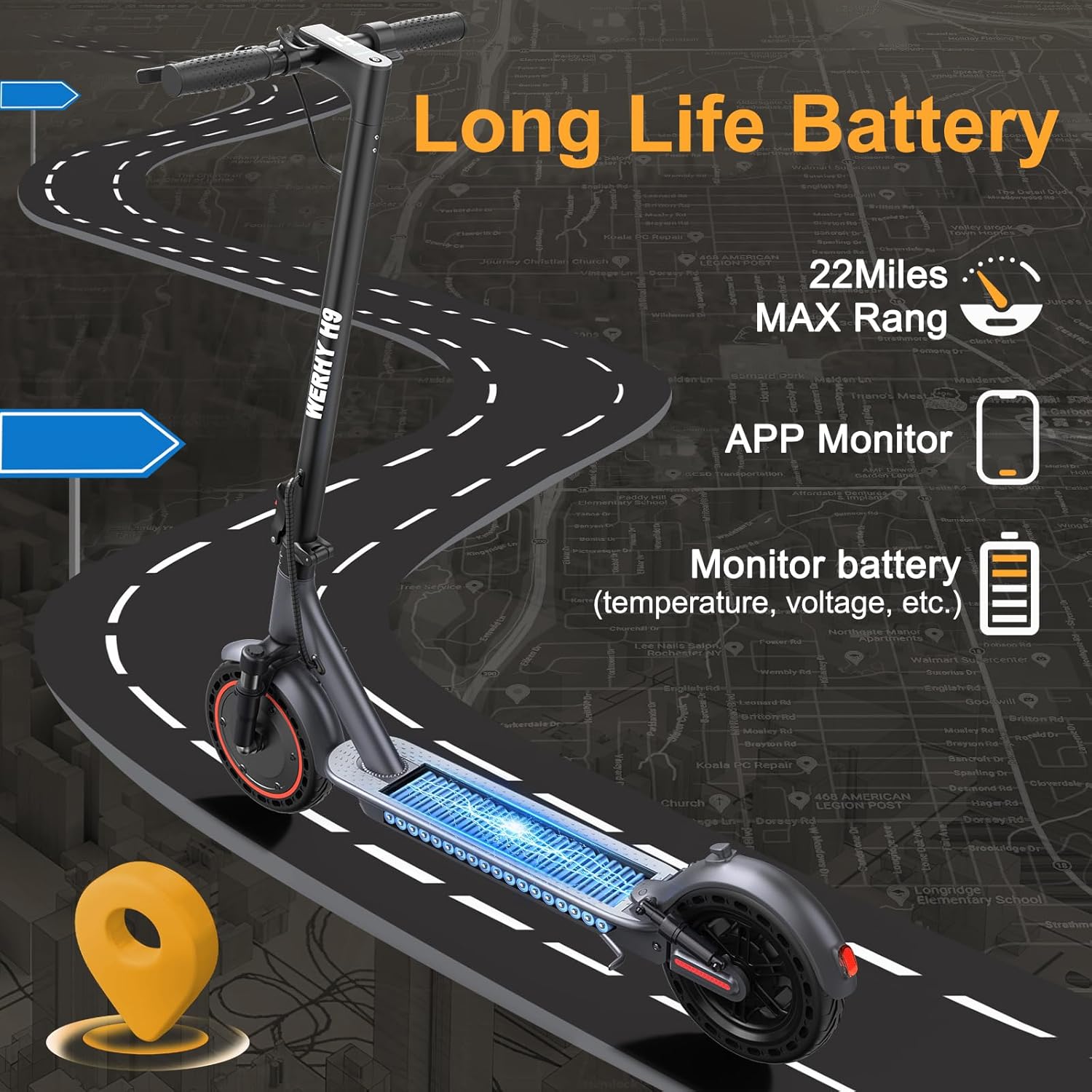 【Sturdy and Dependable】The H9 electric scooter supports a max load of 265 lbs, which can satisfy the needs of various riders. Its sturdy and dependable performance makes it your ideal choice for daily commuting