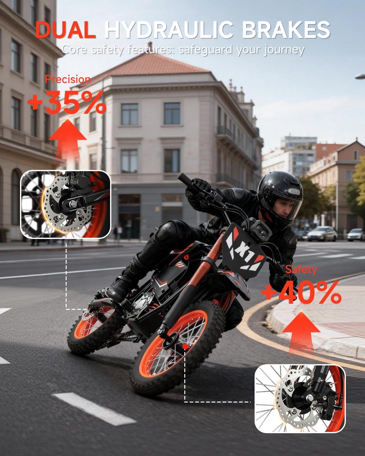 【4500W High-Power Mid Drive Motor】Peak 4500W brushless Mid-Drive Motor delivers massive 283Nm torque for instant acceleration and superior hill climbing. Reach speeds up to 50MPH with smooth, stable power output built for trails, dirt, grass and rugged terrain. Get ready for heart-pumping acceleration and total control.