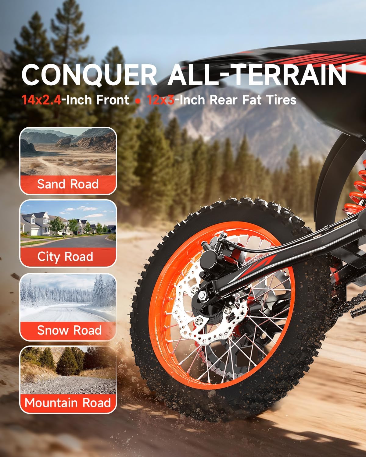 【Built for Teens & Adults】 Frame Designed for riders 4.2-6.0 ft tall, ages 13+. Weighs only 124 lbs but supports up to 350 lbs. 14 front and 12″ rear off-road tires provide excellent traction and balance for both beginners and experienced rider.