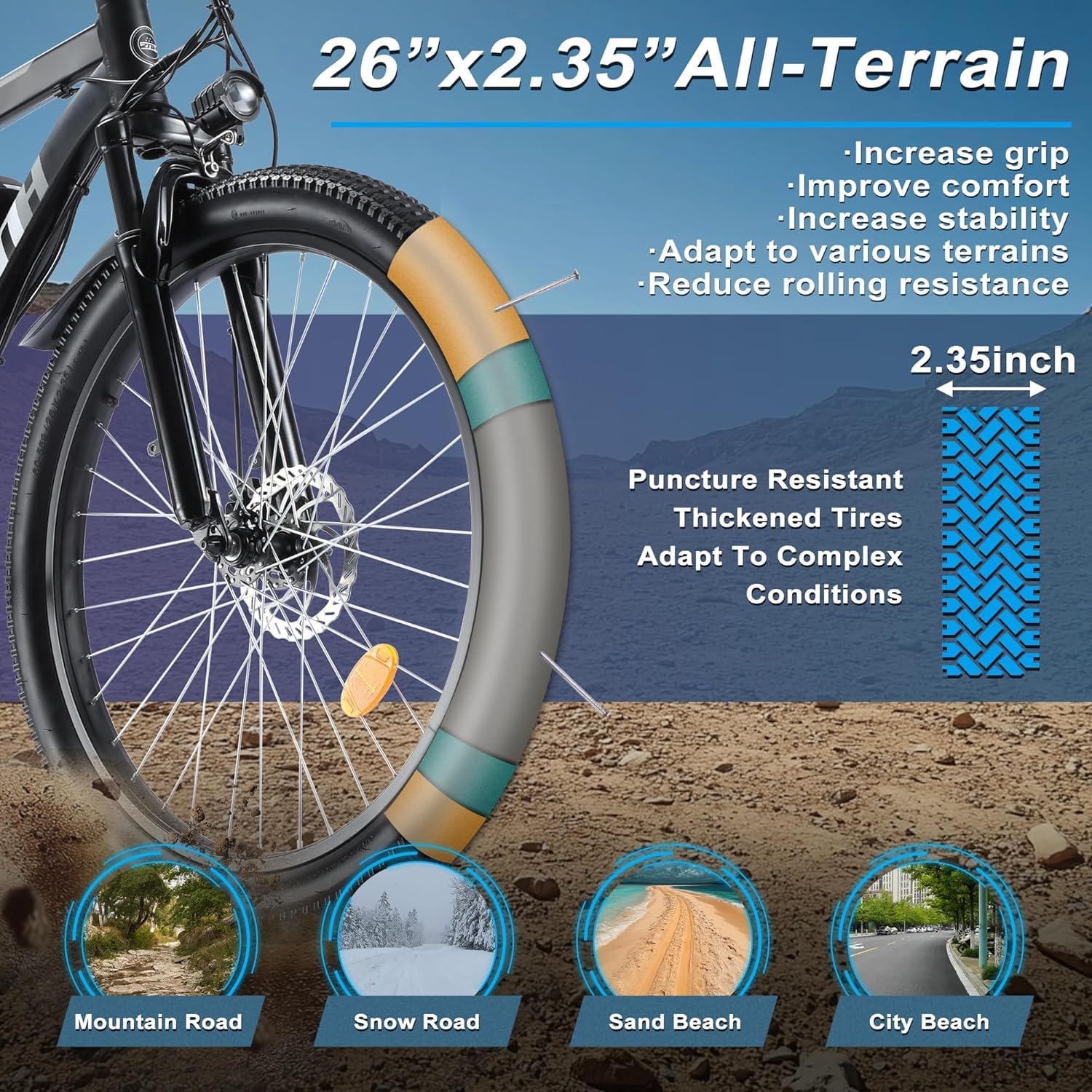 【Versatile All-Terrain Performance】26” electric bike fat tire engineered for daily city commuting, adventurous mountain trails, smooth road cruising, or short-distance touring, this e-bike handles it all. And it’s all-terrain fat tires and front suspension fork ensure a smooth, stable, and comfortable ride on various surfaces.